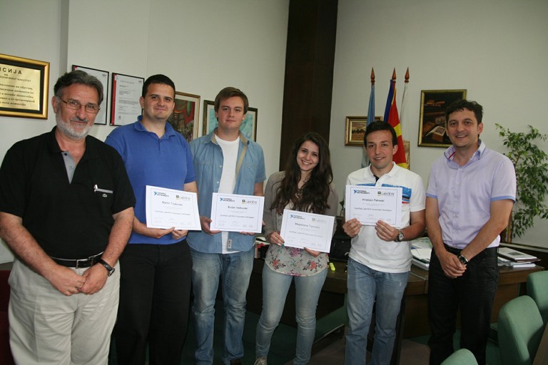 Учесници од ФЕИТ натпреварот по LabVIEW (од лево на десно) Викторија Димова, Стефан Аговски, Бодан Велковски, Живко Коколански (ментор)